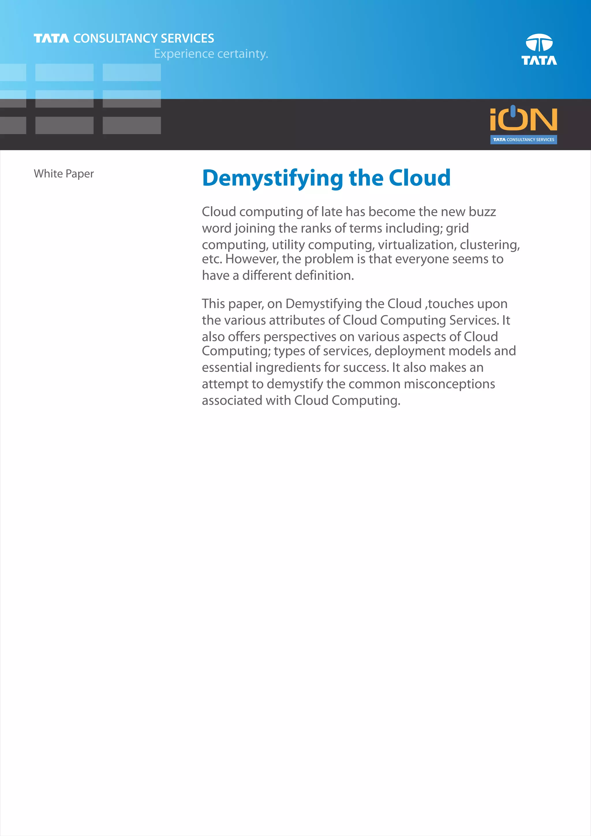 The white paper explores the concept of cloud computing, outlining its definitions, services, deployment models, and common misconceptions. It emphasizes the role of cloud computing in providing scalable, cost-effective IT solutions, especially for small and medium-sized businesses (SMBs). The paper also highlights Tata Consultancy Services' 'IT-as-a-Service' model as a significant advancement in cloud service offerings tailored for SMBs.