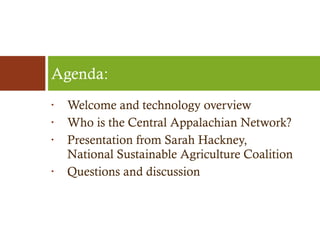 The document provides an overview of the 2012 Farm Bill, discussing the role of the National Sustainable Agriculture Coalition (NSAC) and the Central Appalachian Network in advocating for sustainable agriculture. It outlines the legislative process for reforming the Farm Bill, key goals, and proposed programs, such as the Local Farms, Food, and Jobs Act and the Beginning Farmer and Rancher Opportunity Act. The document emphasizes the importance of grassroots involvement and advocacy in shaping agricultural policy.