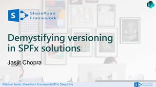 The document discusses an upcoming webinar on SharePoint Framework (SPFx) Deep Dive. The webinar will cover NodeJS, code editors, Yeoman, Gulp, the SPFx roadmap, understanding versioning in SPFx solutions, and working with CI/CD pipelines and versioning. It will also discuss migrations and upgrades when using SPFx. The presenter is Jasjit Chopra, a Microsoft Azure MVP, and the webinar will provide an in-depth look at SPFx.