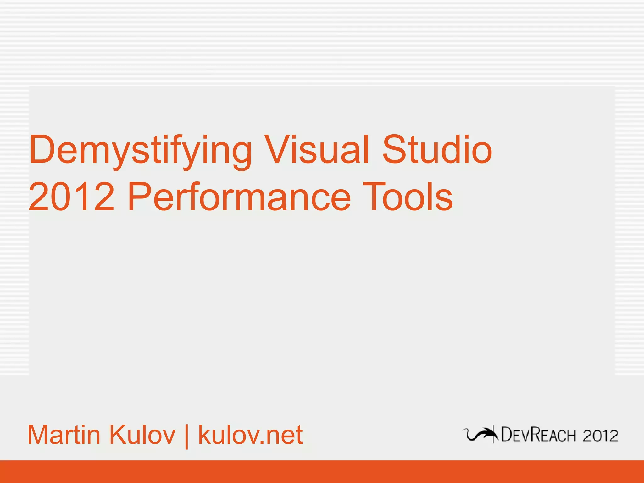 This document discusses various performance analysis tools for Visual Studio including trace analysis, event tracing for Windows (ETW), performance counters, and profiling. It provides information on how these tools can be used to measure code and system performance, gather debugging information like call stacks and symbols, and identify bottlenecks and resource contention. Examples are given of the types of data and events that can be captured from the operating system, .NET framework, and applications to help optimize performance.