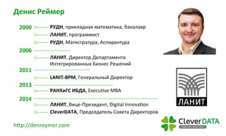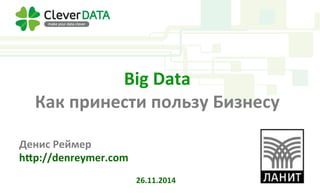 Документ описывает, как большие данные (big data) могут помочь бизнесу в его развитии, акцентируя внимание на важности сбора, хранения и анализа данных для понимания клиентов и их поведения. Рассматриваются современные технологии и платформы для управления данными, а также примеры использования big data в разных областях бизнеса. В заключение подчеркивается необходимость внедрения правильных инструментов и подходов для эффективного использования данных с целью монетизации и повышения операционной эффективности.