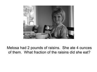 Melosa had 2 pounds of raisins which is equal to 32 ounces total. She ate 4 ounces of the raisins. The fraction of raisins Melosa ate is 4/32 which simplifies to 1/8.