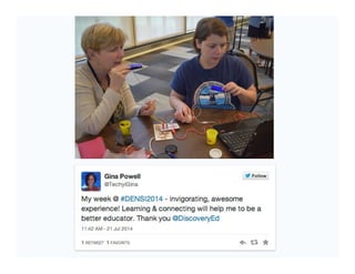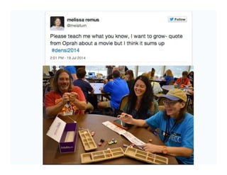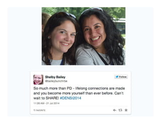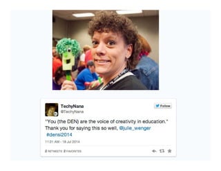 The document discusses an educational conference where the author met people passionate about using technology in the classroom who have strong teaching skills and share their expertise to support education beyond their own settings. The conference helped the author understand that the DEN community celebrates teaching, provides the best learning opportunities for children, and supports a network where everyone shares to help others.