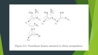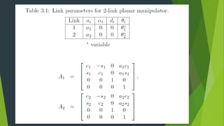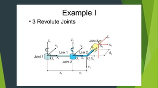 The Denavit-Hartenberg (D-H) convention provides a standardized method to define coordinate frames for each link of a robot manipulator. It uses four parameters - link length (ai), joint angle (αi), link offset (di), and joint twist (θi) - to define the transformation from one link's frame to the next. By applying the homogeneous transformation matrices for each link according to their D-H parameters, the forward kinematics can be calculated to determine the end effector position from the joint parameters. The D-H convention reduces the number of parameters needed compared to other methods.