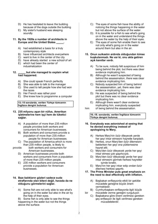 The document is a test that contains multiple choice questions about English grammar and comprehension. It covers topics like verb tenses, parts of speech, sentence structure, and inferring meaning from passages. The summary is: