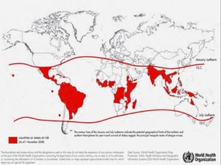 This document provides an overview of dengue virus, the disease it causes, epidemiology, pathogenesis, clinical presentation, diagnosis and prevention. It discusses the four serotypes of dengue virus and its mosquito vectors. It describes how the virus is transmitted between humans and mosquitoes. Clinical features of both dengue fever and dengue hemorrhagic fever are outlined. The document reviews various laboratory diagnostic methods including antigen detection, antibody detection, molecular detection and virus isolation. Prevention and management of dengue focuses on mosquito control and supportive care.