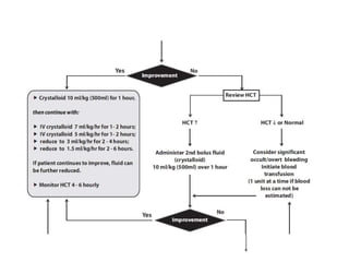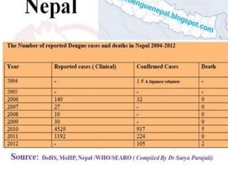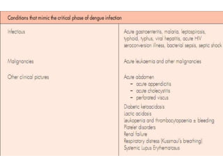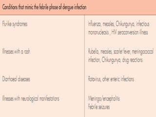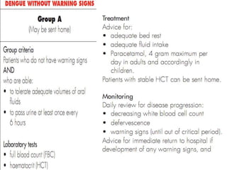 This document provides an overview of dengue, including its epidemiology, life cycle, pathogenesis, clinical features, diagnosis, management, prognosis, and prevention. Some key points: