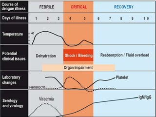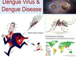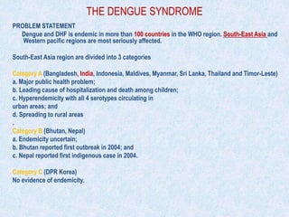 The document discusses dengue, which is endemic in many countries in Southeast Asia and the Western Pacific. It categorizes countries in Southeast Asia based on their dengue situation. India is experiencing an increase in dengue risk due to factors like rapid urbanization and lifestyle changes. The dengue virus has four serotypes and infection with one provides immunity to that serotype. Secondary infection or infection with multiple serotypes can cause severe dengue hemorrhagic fever. The Aedes mosquito transmits dengue virus between humans. Environmental factors like rainfall and temperature affect mosquito populations and transmission rates.