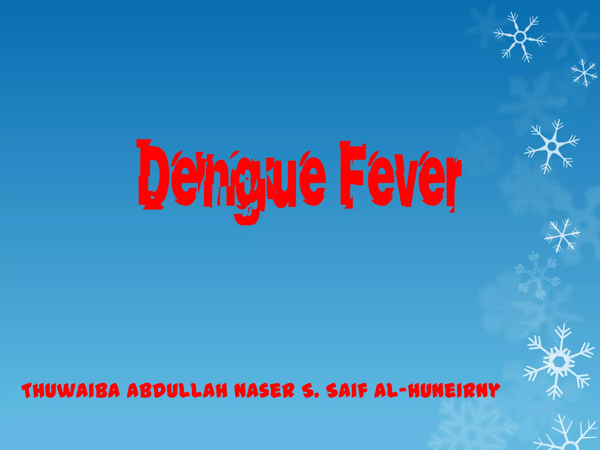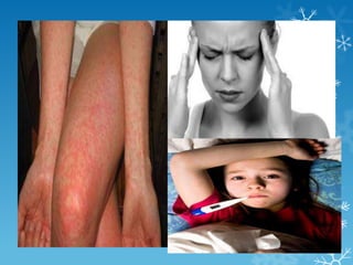 Dengue fever is a disease caused by a family of viruses transmitted by mosquitoes. It causes high fever, severe headache, pain behind the eyes, joint and muscle pain, and sometimes a rash. The incubation period is 3-14 days after exposure. There is no specific treatment for dengue fever since it is caused by a virus. Treatment focuses on preventing dehydration with intravenous fluids and painkillers. For severe cases, blood transfusions or hospitalization may be needed. Prevention efforts include wearing protective clothing, using mosquito nets and traps, avoiding standing water where mosquitoes breed, and staying indoors at dawn and dusk.