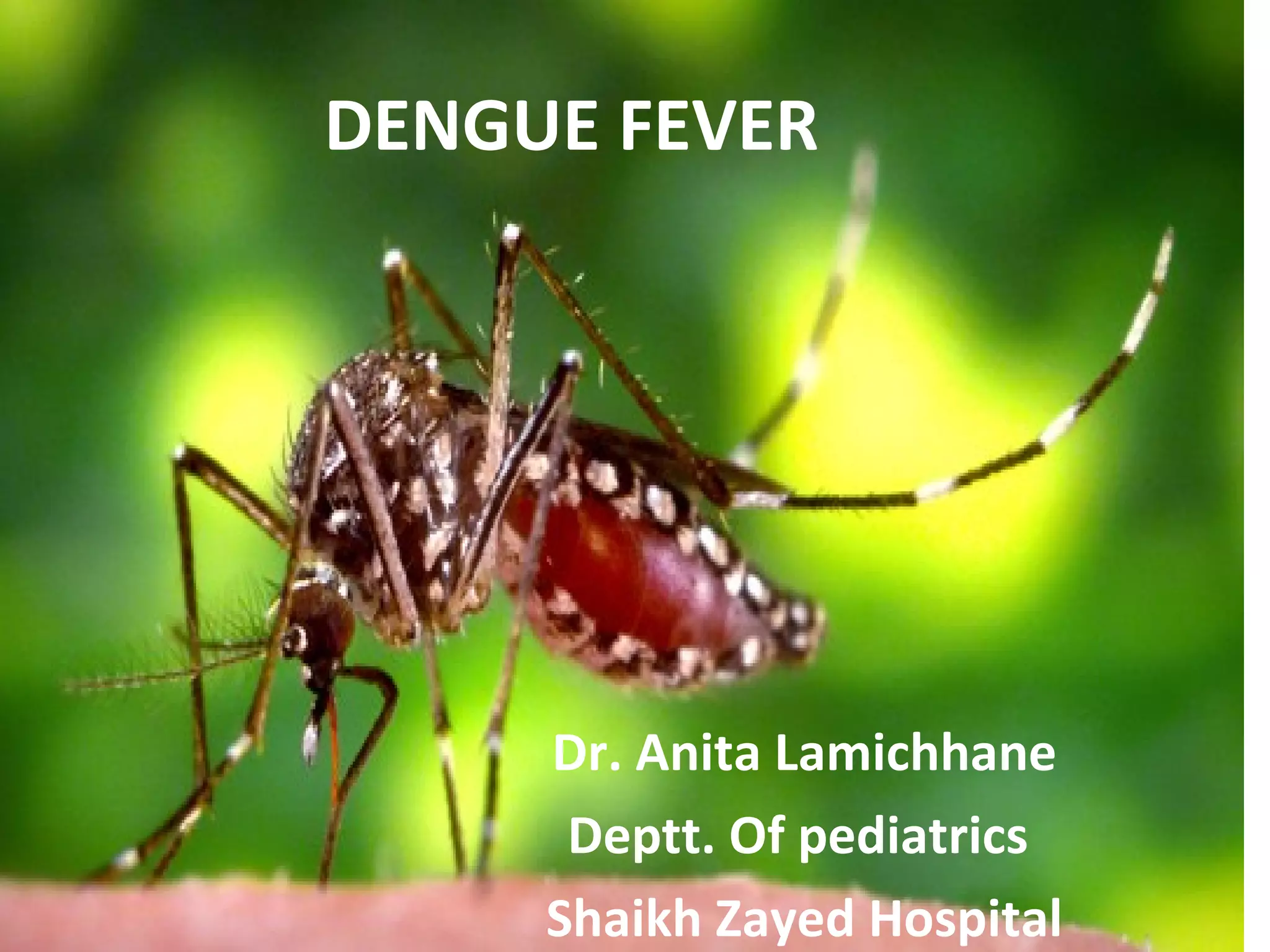 Dengue fever is caused by the dengue virus, which is transmitted by the Aedes aegypti mosquito. It has four distinct serotypes. The virus replicates in the mosquito and humans, who serve as the primary reservoir of infection. Symptoms range from a mild fever to the potentially lethal dengue hemorrhagic fever. There is no vaccine, so prevention depends on controlling the mosquito population and avoiding bites.