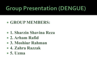 This document discusses dengue fever, which is transmitted by the Aedes aegypti mosquito. It describes the mosquito's life cycle and breeding habits. There are four types of dengue viruses that cause the disease. Symptoms include fever, headache, rash and joint pain. While historically a rural disease, dengue has emerged as a global threat present in tropical and subtropical regions. Prevention efforts include eliminating standing water and using protective clothing and repellents.