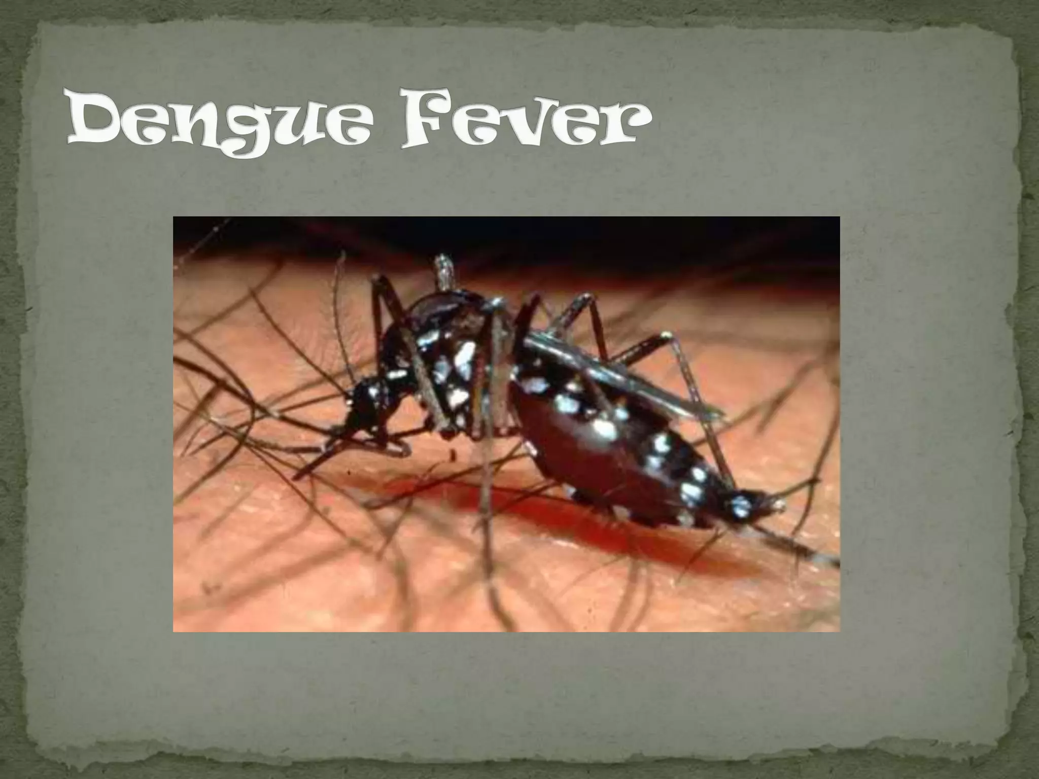 Dengue fever is a disease caused by one of four viruses and transmitted by mosquitoes. It causes symptoms like headache, fever, joint pain, and rash. There are four different serotypes of the virus, so it is possible to get dengue multiple times. More severe forms include dengue hemorrhagic fever and dengue shock syndrome, which can be life-threatening. Treatment focuses on relieving symptoms as there is no specific medicine for the viral infection.