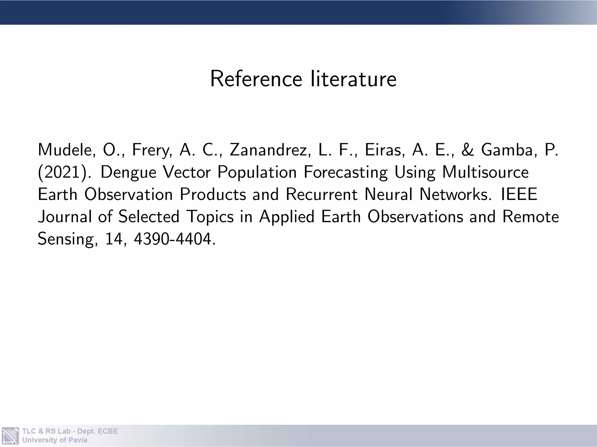 The document describes a methodology for forecasting dengue vector populations one week ahead using multi-source earth observation data and recurrent neural networks. The methodology clusters mosquito population ground truth data using k-means clustering. It then trains an encoder-decoder LSTM neural network on time series data of earth observation features means for each cluster. The model is tested against random forest and k-nearest neighbor models on data from two locations in Brazil. Results show the LSTM model more accurately follows the highest and lowest observed mosquito population values compared to the other models.