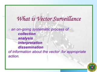 Vector surveillance involves the ongoing collection, analysis, and dissemination of mosquito data to inform appropriate public health actions. The key objectives are to monitor mosquito populations and breeding sites to determine infection risk levels and recommend prevention/control measures. Common surveillance methods include adult mosquito collection, pupal surveys, larval surveys, and ovitrapping. Larval surveys inspect water containers to calculate larval indices like House Index, Container Index, and Breteau Index. Analysis of findings considers vector characteristics, community factors, and prioritizes areas for intervention and monitoring based on mosquito density levels. The information benefits various stakeholders for public health decision-making and research.