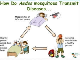 Dengue fever is an infectious disease caused by the dengue virus and transmitted by Aedes mosquitoes. It causes flu-like symptoms and in rare cases may progress to life-threatening dengue hemorrhagic fever or dengue shock syndrome. There is no vaccine or cure, so prevention focuses on eliminating mosquito breeding sites and reducing exposure to bites. The disease is increasing globally due to factors like urbanization, travel, and climate change.