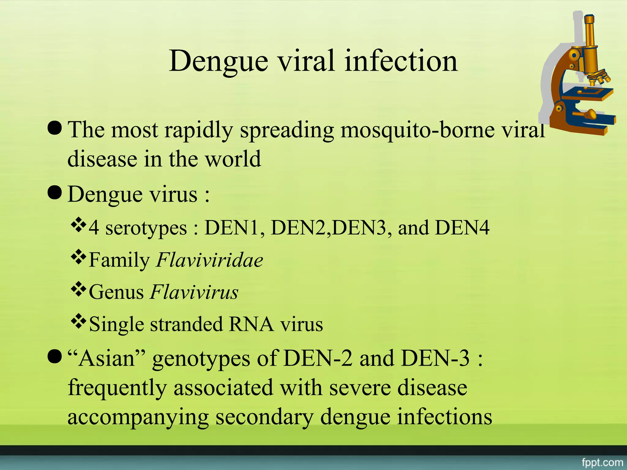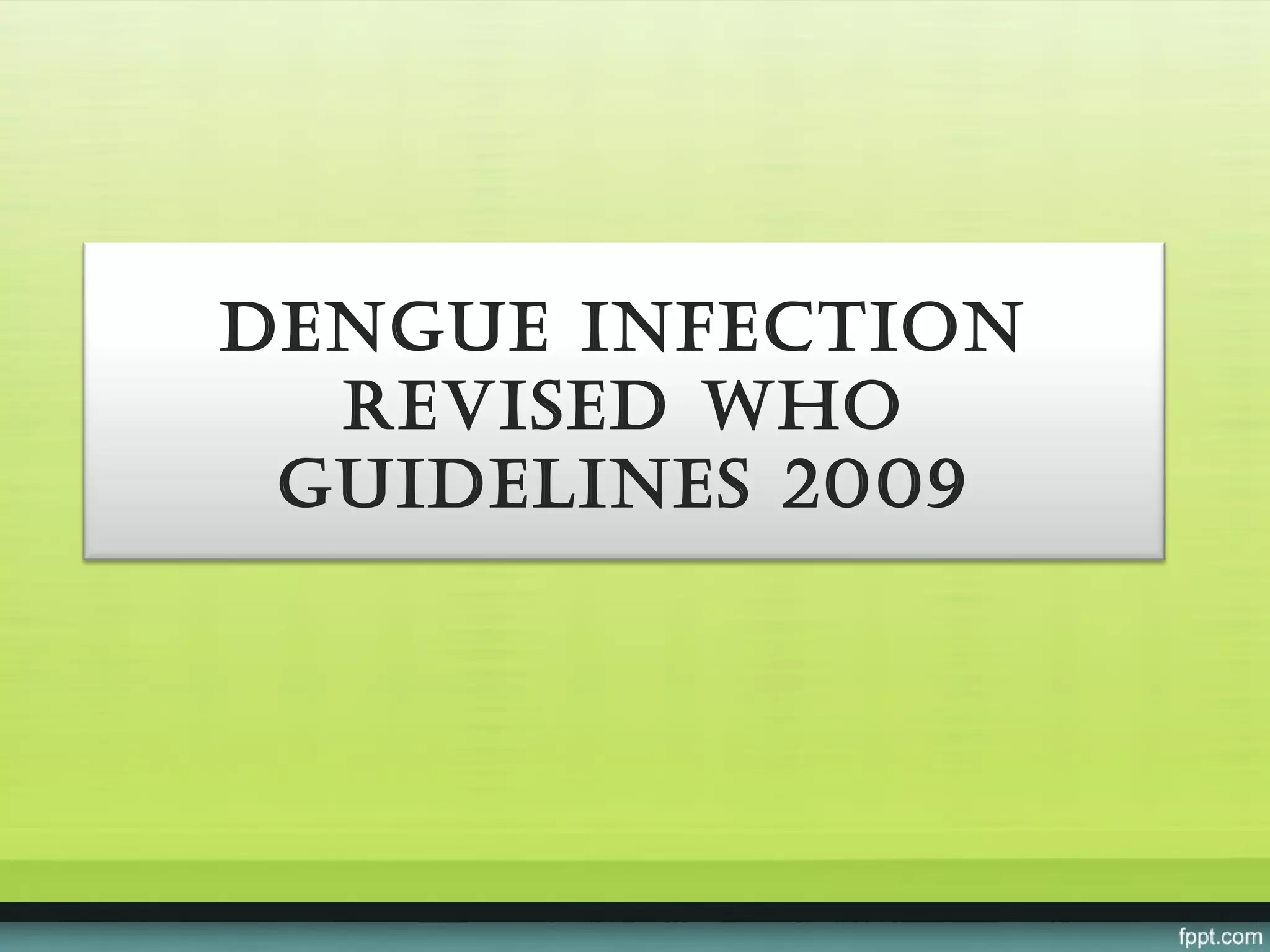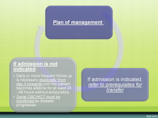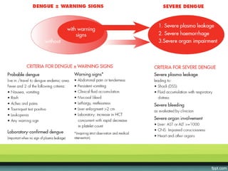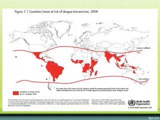 The document provides guidelines on dengue infection, discussing the clinical syndromes of dengue fever and dengue hemorrhagic fever, their diagnosis and classification, management approaches including fluid resuscitation, and treatment of complications. It describes dengue virus and the disease it causes, including its pathophysiology, clinical course, and atypical manifestations. Risk factors, vectors, and the immune response to primary and secondary infections are also covered.