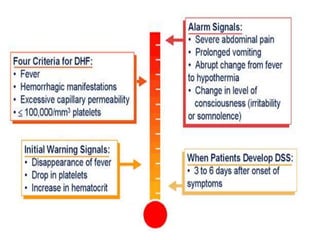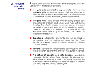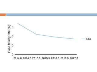 Dengue is a mosquito-borne viral disease that has been an increasing problem in India. It is transmitted by the Aedes aegypti mosquito. There are typically two peaks of dengue outbreaks annually in India. The number of reported cases and deaths has been increasing, with over 99,000 cases and 220 deaths in 2015. The goal of the Global Strategy for Dengue Prevention and Control is to reduce dengue mortality by at least 50% and morbidity by 25% by 2020 through reducing mosquito populations, public education, and emergency response planning. Diagnosis involves virus isolation, antibody detection, or PCR testing. There is no vaccine for dengue prevention currently.