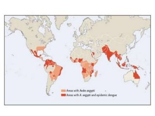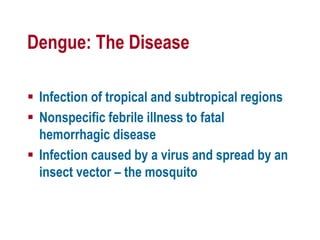 This document summarizes information about dengue fever and dengue hemorrhagic fever (DHF). It describes how dengue is caused by one of four viruses spread by the Aedes mosquito. It can present as a mild fever or potentially fatal DHF. DHF results from a secondary infection by a different virus serotype and is characterized by plasma leakage that can lead to shock. The document outlines the clinical features, diagnosis, management and prevention of dengue fever and DHF.