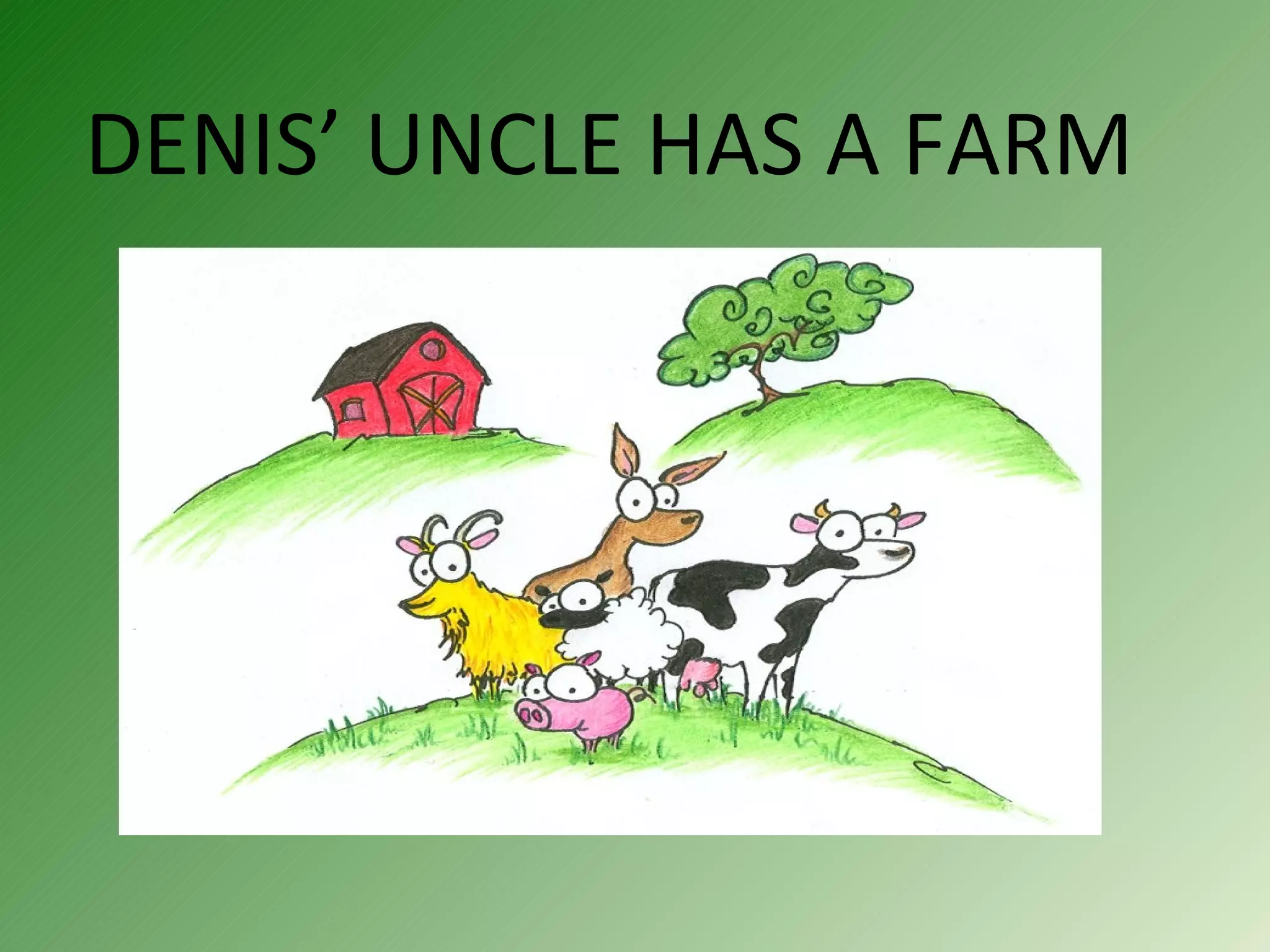 The document is a song about different animals on Denis's uncle's farm. Each verse introduces a new animal such as a cow, sheep, pig, chick, chicken, or duck. For each animal, the song describes the sounds they make, with "moo" for cows, "baa" for sheep, "oink" for pigs, "chick" for chicks, "cluck" for chickens, and "quack" for ducks. It encourages learning the names of farm animals in English and discusses the importance of farmers and caring for animals.