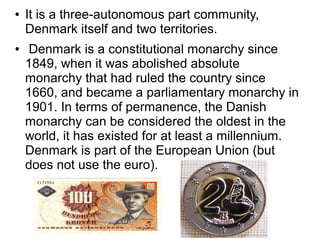 Denmark is a three-part autonomous community consisting of Denmark itself and two territories. It has been a constitutional monarchy since 1849 and a parliamentary monarchy since 1901, making its monarchy one of the oldest in the world. The Danish flag originated from a legend about falling from heaven during a battle in Estonia. Copenhagen has been the capital of Denmark since the early 15th century and contains landmarks like the Little Mermaid statue and Amalienborg Palace, the residence of the Danish royal family.