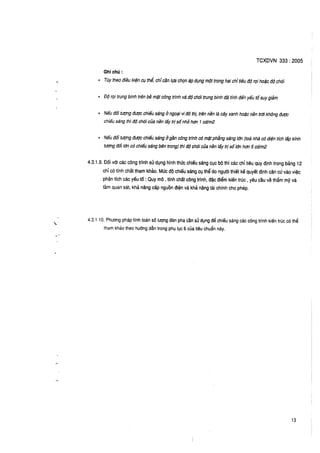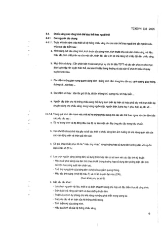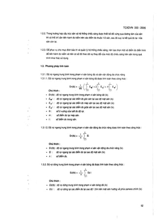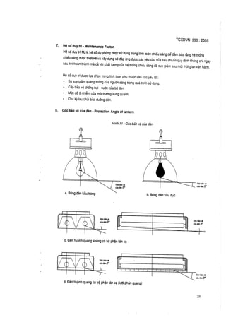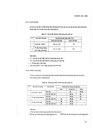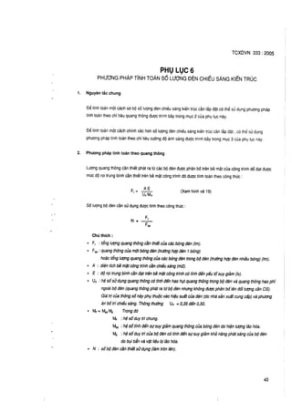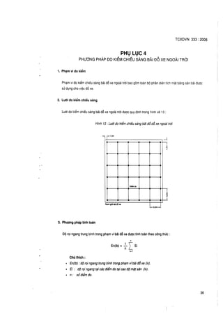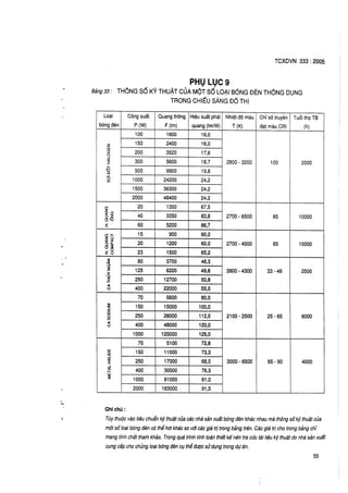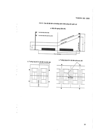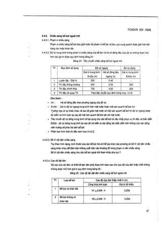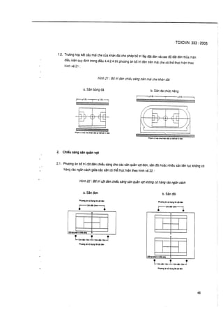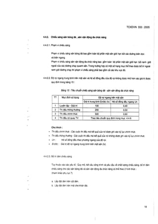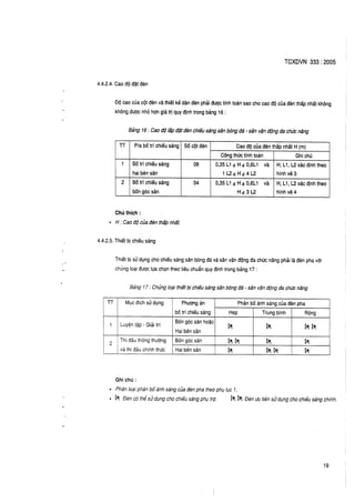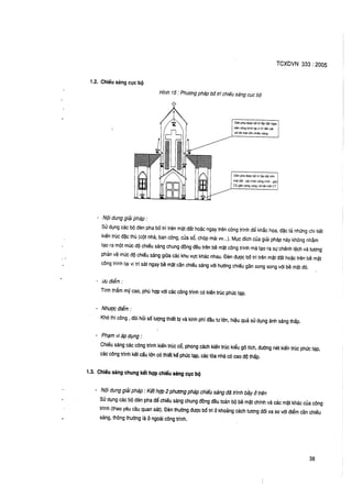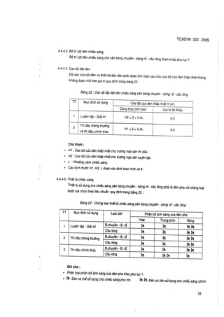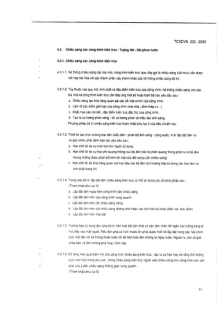 Tiêu chuẩn TCXDVN 333:2005 quy định về thiết kế chiếu sáng nhân tạo bên ngoài các công trình công cộng và kỹ thuật hạ tầng đô thị tại Việt Nam, thay thế cho tiêu chuẩn cũ 95:1983. Tiêu chuẩn này áp dụng cho việc thiết kế, giám sát và nghiệm thu các công trình chiếu sáng ngoài trời, bao gồm các điểm đỗ giao thông, đường, cầu, vườn hoa và các công trình thể dục thể thao. Các yêu cầu kỹ thuật cụ thể về độ rọi, hiệu quả sử dụng điện năng và an toàn trong thiết kế chiếu sáng cũng được đề cập để đảm bảo tính mỹ quan và giảm hiện tượng ô nhiễm ánh sáng.