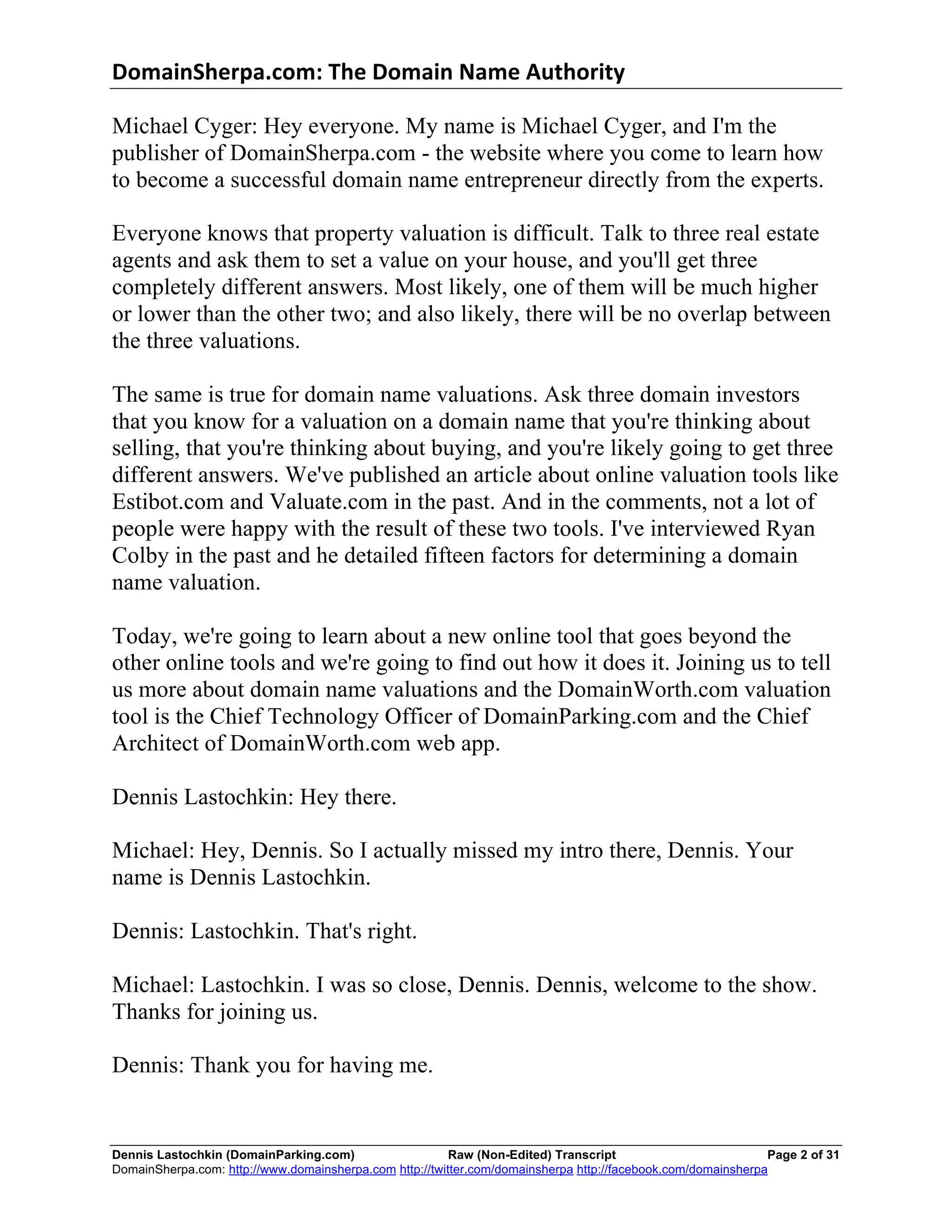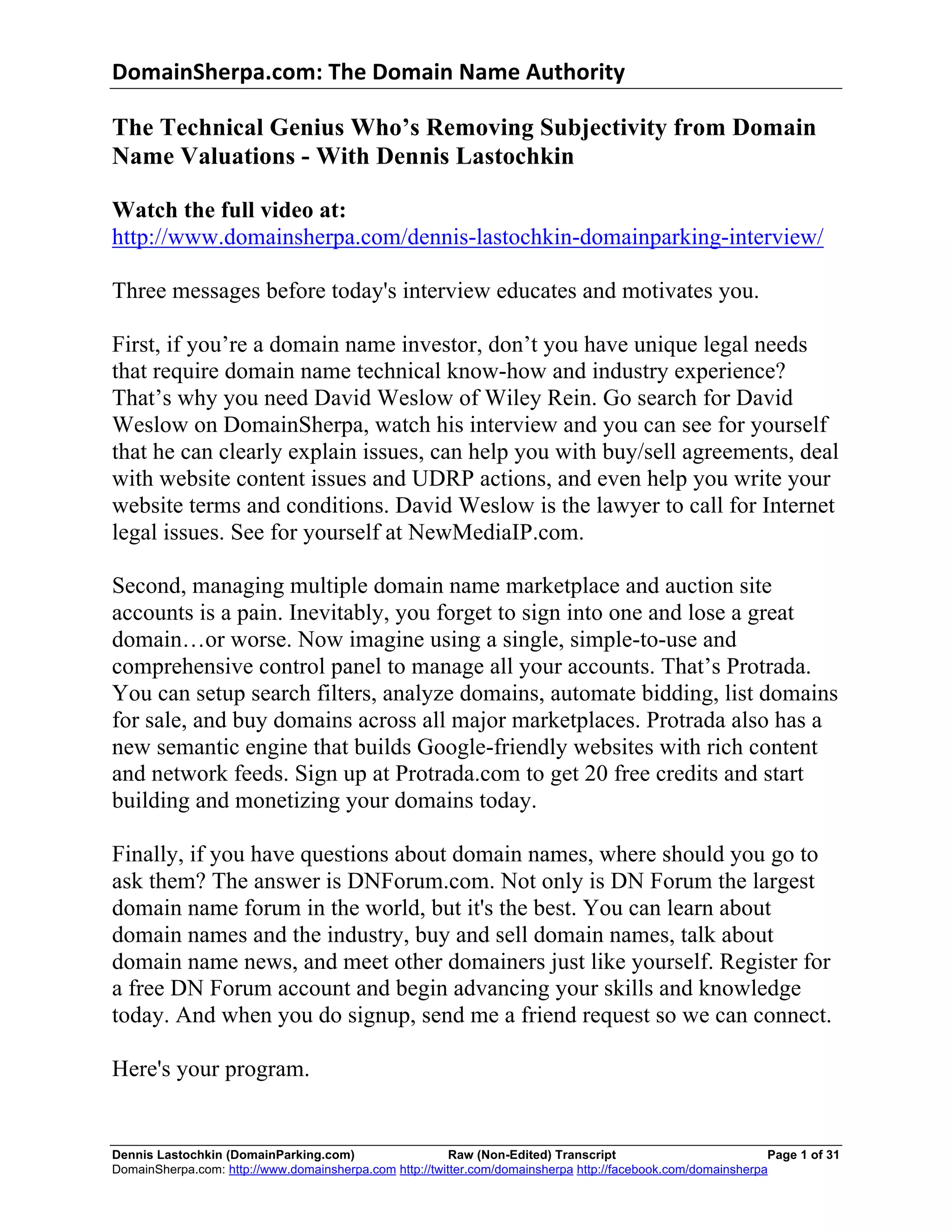 The document features an interview with Dennis Lastochkin, the chief technology officer of Domainparking.com and architect of Domainworth.com, discussing the challenges of domain name valuation. Lastochkin introduced a new online tool, Domainworth.com, which aims to provide reliable domain valuations while minimizing the subjectivity commonly found in the industry. He highlights the tool's effectiveness, achieving a high accuracy rate during a live auction setting, and shares insights into his extensive background in technology and domain management.