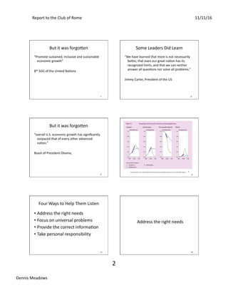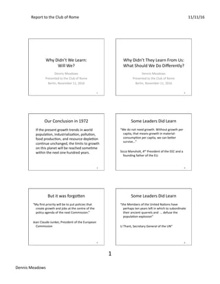 Dennis Meadows gave a report to the Club of Rome on November 11, 2016 about why warnings from past reports on limits to growth have been forgotten. The report discussed how some world leaders in the past acknowledged the issues but priorities reverted back to economic growth. Meadows provided recommendations on how to better communicate these issues to leaders, including focusing on universal problems, providing the right information, and taking personal responsibility rather than just telling others what to do.