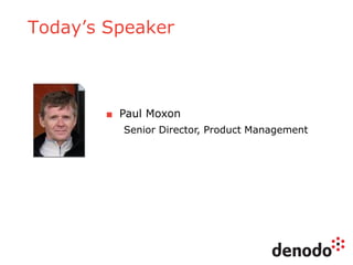The document outlines a series of five webinars focusing on the Denodo platform, particularly addressing performance and scalability. It covers advanced query optimization techniques, architecture modules, and features of Denodo Express, a free data virtualization platform. Key topics include query plan generation, execution engine responsibilities, and mechanisms for performance optimization and caching.
