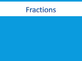 This document defines fractions and their key components. It explains that a fraction represents a part of a whole that is divided into equal parts. The denominator indicates how many equal parts make up the whole, while the numerator specifies how many of those parts are being considered. It provides examples of writing, interpreting, and drawing different fractions based on these definitions.