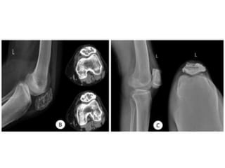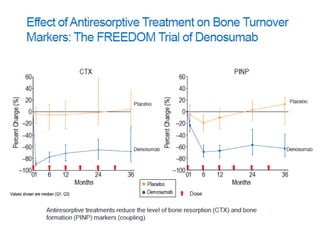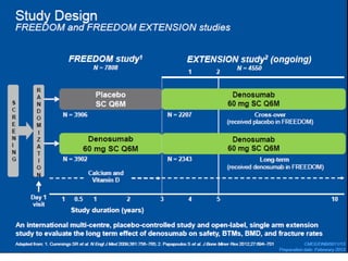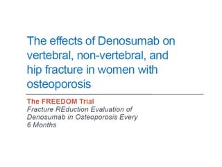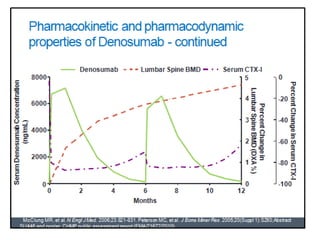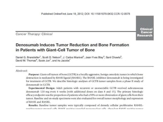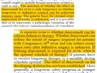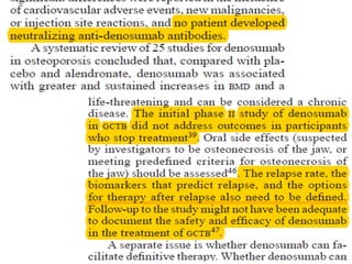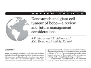 Donesumab is a monoclonal antibody that inhibits RANKL, a protein involved in bone resorption. It is approved to treat osteoporosis and increase bone mass in high risk patients, as well as to prevent skeletal complications in patients with bone metastases or giant cell tumor of bone. Common side effects include back pain, joint pain, and hypocalcemia. While early studies found Denosumab reduced tumor giant cells and risk of recurrence in giant cell tumor patients, one case report found malignant transformation in a patient after long term use. Further research is still needed on its use for giant cell tumor.