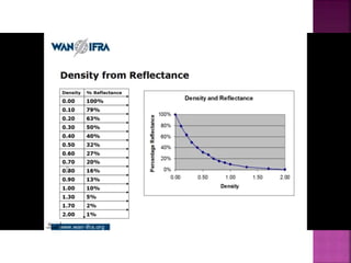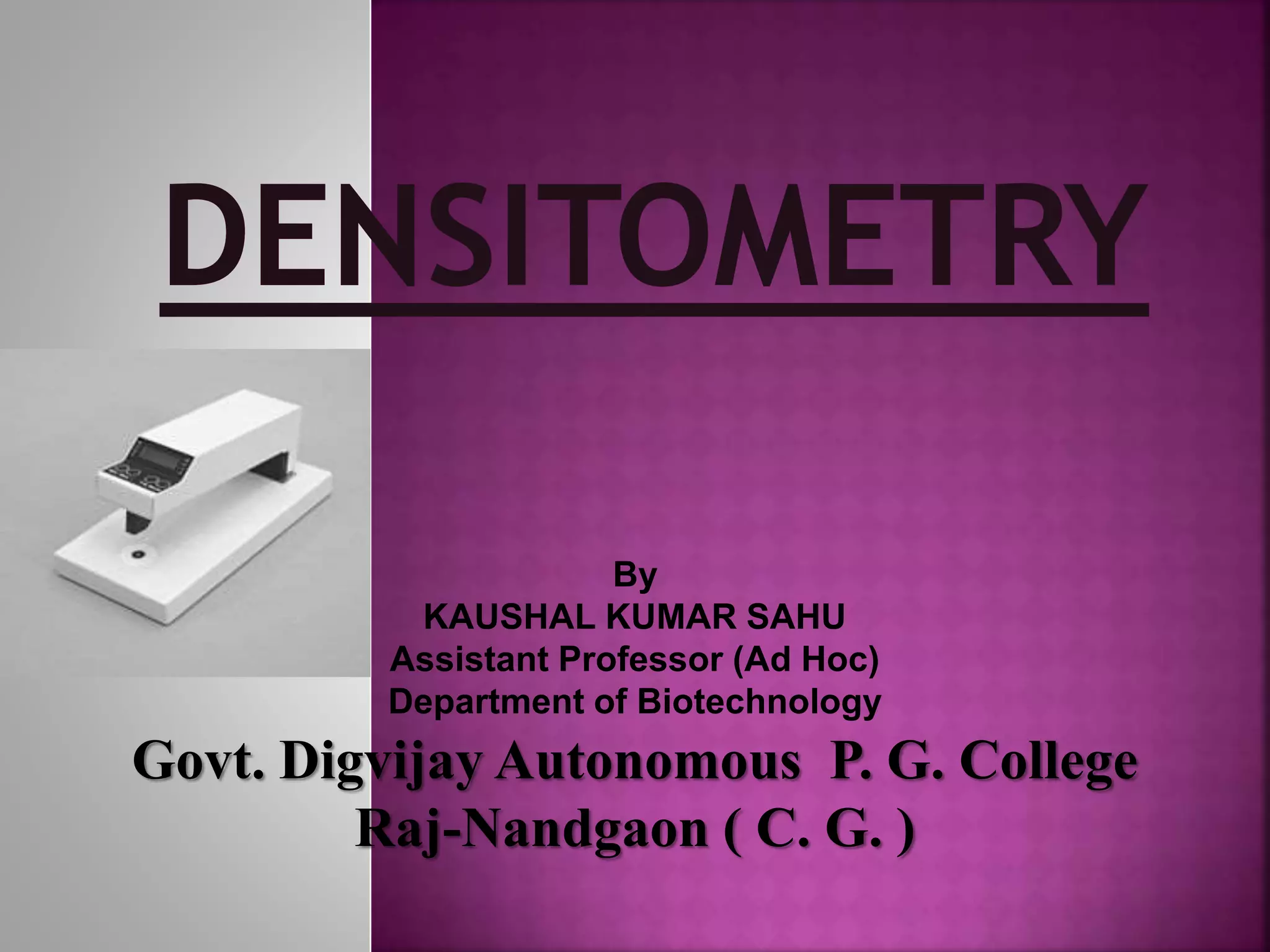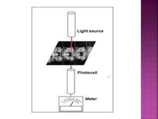 The document explains densitometry, detailing its definition, principles, and types, including transmission, reflection, and combination densitometers. It describes how densitometers measure optical density in materials like photographic films and their applications in fields such as printing and medical diagnostics, including bone densitometry. Additionally, it references foundational laws (Beer's and Lambert's) that govern the measurement processes.