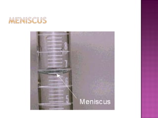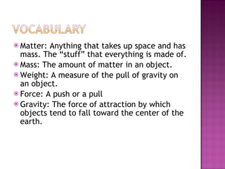 The document defines several key scientific concepts including matter, mass, weight, force, gravity, volume, meniscus, density, and lists several related labs. Matter is anything that takes up space and has mass. Mass is the amount of matter in an object, while weight is a measure of gravitational pull. Density is a property relating an object's mass to its volume.