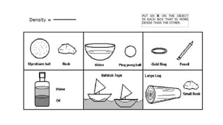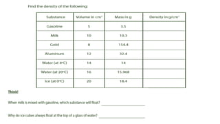 A tonne of lead and a tonne of feathers have the same mass because a tonne is defined as 1000 kg. While feathers take up more space than lead, the mass of each is the same since they are equal volumes. Density is calculated by dividing the mass of an object by its volume and compares how compact or spread out the mass is. Higher densities mean more mass is packed into a smaller volume. Common materials like wood, water and iron are provided as examples to compare densities based on a 1 cm3 sample of each.