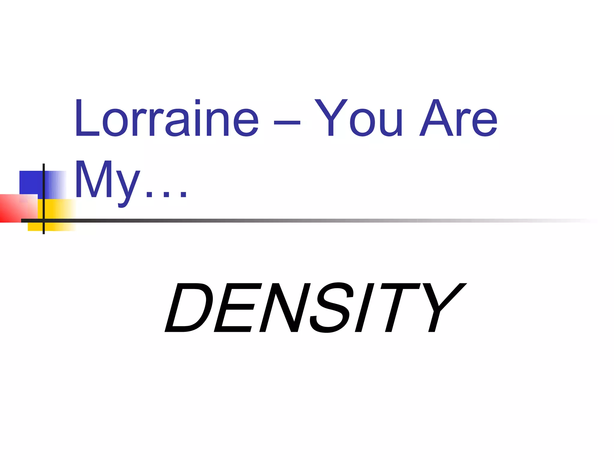 The document discusses density and its calculation. Density is defined as mass divided by volume, with units of grams per cubic centimeter (g/cm3). Volume can be measured directly for simple shapes using length x width x height, but for complex shapes it is equal to the volume of water displaced. Archimedes' principle of buoyancy established that the volume of an object is equal to the volume of fluid it displaces. Density can be used to identify whether an object will float or sink in water depending on if its density is less than, greater than, or equal to the density of water, which is 1g/cm3. Density is an intrinsic property that can be used to identify materials.