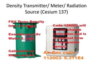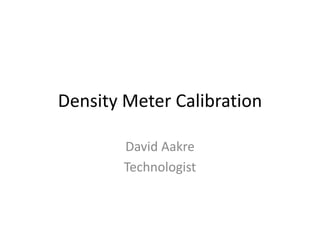 This document provides instructions for calibrating a density meter and summarizes procedures for testing density measurement systems using frac slurry mixtures. It outlines a two-point calibration process using air and water, recording calibration results for restoring meter settings, and calibrating on different fluid types. It also describes preparing frac slurry mixtures with various additives to achieve different densities, measuring the true densities of the mixtures, and using the mixtures to calibrate or test a densometer by taking pressure readings and comparing to known densities. The goal is to practice density measurement techniques and calibrate equipment.