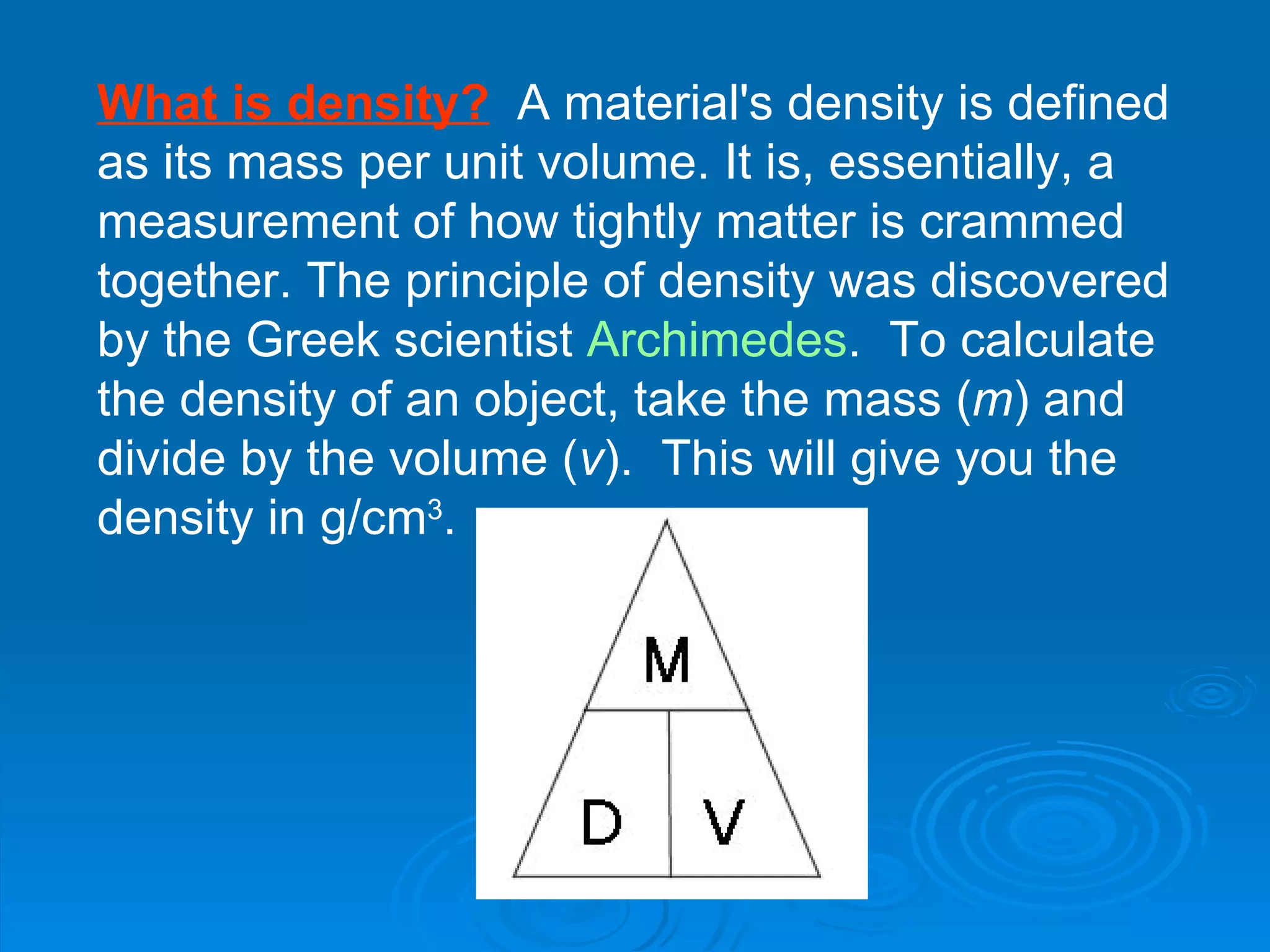 Density is a measurement of how tightly matter is packed together in an object. It is calculated by dividing an object's mass by its volume. Ice floats in water because it has a lower density than water - ice has a density of about 0.9 g/cm3 while water has a density of 1 g/cm3. Hot air balloons and magma rise because they have lower densities than the surrounding air and rock, respectively. A ship will float if its overall density is less than that of water, which is 1 g/cm3.