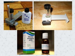 Dental amalgam is an alloy used in dental restorations composed of silver, tin, copper and sometimes zinc, mixed with liquid mercury. The document outlines the formulation, classification, setting reaction and properties of dental amalgam. It discusses factors that affect the strength and longevity of restorations, such as trituration technique and condensation pressure. While concerns exist regarding mercury toxicity, advocates argue that with proper handling techniques exposure is minimal, and no safer and more durable alternative has been found.
