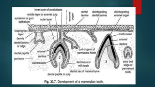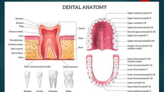 The document discusses the anatomy and structure of different types of teeth. It describes incisors as flat teeth used for cutting, with a single root. Canines are pointed for tearing with a single root. Premolars, also called bicuspids, have two ridges or cusps in the crown and one or two roots to help grind food. Molars also have two ridges or cusps in the crown and one or two roots for chewing and grinding food. The document then provides more detailed descriptions of the layers, roots, and functions of incisors, canines, and premolars.