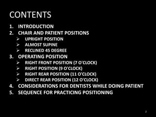 The document discusses dental chair and patient positioning. It describes upright, almost supine, and reclined 45 degree positions for patients. Operating positions for the dentist are defined relative to a clock, including right front (7 o'clock), right (9 o'clock), right rear (11 o'clock), and direct rear (12 o'clock). The sequence for establishing proper positioning is outlined as: 1) operator position, 2) patient chair and head position, 3) equipment adjustment, 4) non-dominant hand placement, and 5) dominant hand placement. Correct positioning is important for operator ergonomics and visibility during dental procedures.