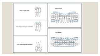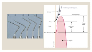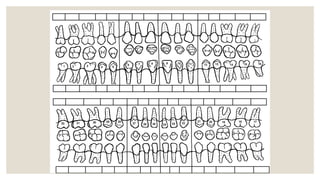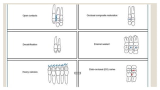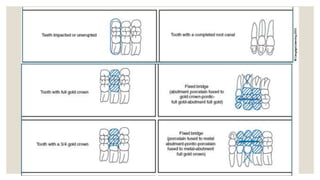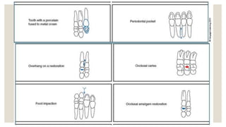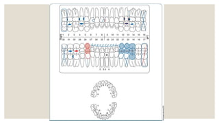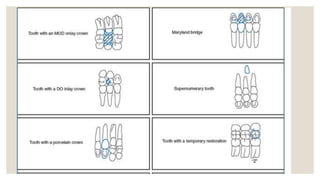 This document defines key dental terminology and describes how to chart dental conditions. It explains that charting uses colors and symbols to indicate a patient's dental status and needed treatment. Red indicates work to be done, while blue indicates completed work. Lines and fill patterns show restoration types like amalgam, composite, gold, and porcelain. Common conditions that can be charted include decay, missing teeth, fractures, crowns, bridges, implants, root canals, mobility, furcation involvement, pockets, and periodontal disease classification. Accurate charting is important for treatment planning and record keeping.