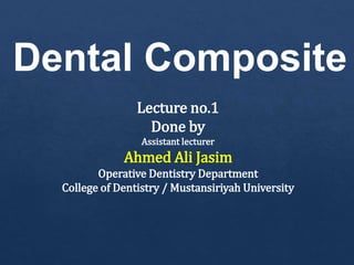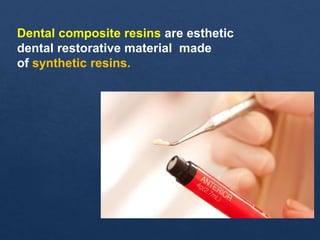This document discusses dental composite materials. It provides a brief history, noting their introduction in the 1960s and improvements over time, including the development of microfilled and hybrid composites in the 1980s-1990s. The document outlines the composition of dental composites, including monomers, photo initiators, fillers like silica and glass. It also discusses different filler types and particle sizes, as well as setting mechanisms like chemical, light, and dual cures. Advantages include esthetics, bonding to tooth structure, and disadvantages include shrinkage and required skill. The document classifies composites by handling characteristics and location of restoration fabrication. It concludes with the method and clinical application of dental composites.