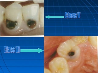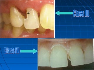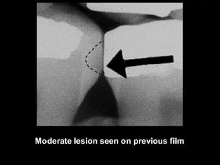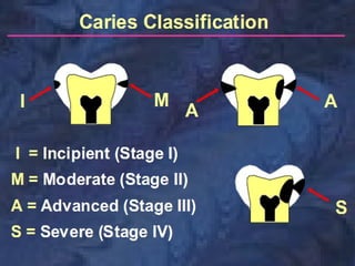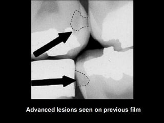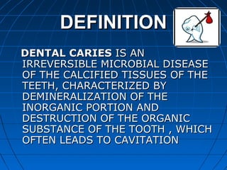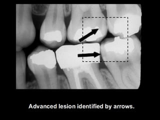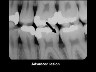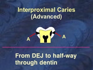 Dental caries is an irreversible microbial disease that causes demineralization and destruction of tooth structure, often leading to cavitation. It is classified based on anatomical site as occusal, smooth surface, or root caries. Inter proximal caries specifically refers to caries between teeth, which can be detected via bite-wing x-rays for low or moderate risk patients. Proper dental care and hygiene is important to prevent recurrent caries.