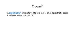 The document discusses different types of dental crowns such as porcelain-fused-to-metal crowns, all-ceramic crowns, and gold alloy crowns, explaining that crowns are fixed prosthetics used to cover and strengthen damaged teeth or dental implants and improve appearance. It also compares analog and digital dental lab workflows, noting that digital workflows using intraoral scanning and CAD/CAM design and milling can provide improved speed and accuracy over traditional analog methods.