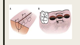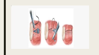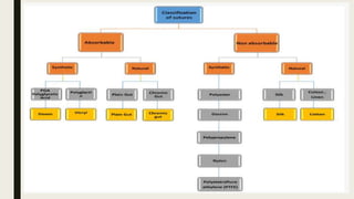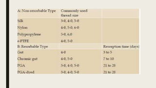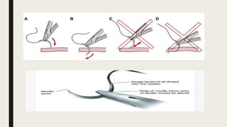 This document discusses dental suturing materials and techniques. It begins by outlining the objectives and requisites of suture materials, such as high tensile strength, sterility, and biocompatibility. The document then classifies suture materials based on factors like absorbability, source, structure and coating. Specific natural and synthetic absorbable and non-absorbable suture materials are described in detail. Principles of suturing techniques and different suturing techniques like interrupted, continuous, and mattress stitches are explained. Suturing instruments and needles are also discussed.