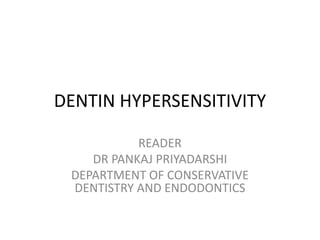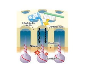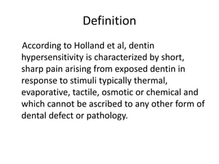 Dentin hypersensitivity is characterized by short, sharp pain from exposed dentin in response to stimuli like heat, cold, sweet foods, or toothbrushing. It occurs when gums recede or enamel is lost, exposing open dentin tubules. The hydrodynamic theory explains that stimuli cause fluid movement in dentin tubules, activating nerve endings and causing pain. Treatment focuses on desensitizing nerves with potassium nitrate toothpaste or occluding tubules with agents like fluoride, CPP-ACP, or resins to block fluid flow and pain signals.