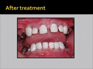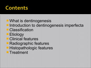 This document provides an overview of dentinogenesis imperfecta. It begins with an introduction to dentin formation and classification systems for dentinogenesis imperfecta. It then describes the etiology as a genetic disorder involving mutations in the DSPP gene. Clinical features include opalescent teeth that become gray/brown with age and obliterated pulp chambers. Radiographic features include bulbous crowns and thin roots. Histopathology shows abnormal dentin formation. Treatment aims to prevent attrition and involves restorations like crowns. The document provides details on different subtypes and clinical management.