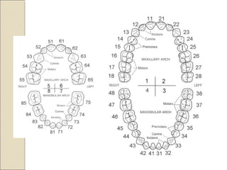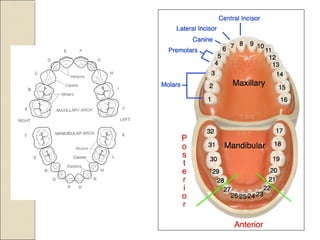 The document discusses dental anatomy and terminology. It defines key terms like maxilla, mandible, quadrants, and different classes of teeth. It describes primary and permanent dentitions, noting the number and type of teeth in each. Key tooth surfaces like facial, lingual, proximal, and occlusal are defined. Tooth anatomy includes the crown, neck, root and their microstructures like enamel, dentin, cementum and pulp. Landmarks like cusps, lobes, and ridges are also outlined. Palmer notation and other numbering systems for identifying individual teeth are introduced.