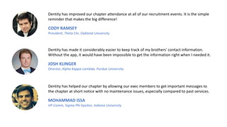 Dentity is a highly effective communication tool for Greek organizations, providing seamless access to member contact information and facilitating quick communication about events. Users report improved attendance and organization within their chapters, as well as enhanced connectivity among members. Overall, dentity is praised for simplifying communication and fostering community within fraternities and sororities.