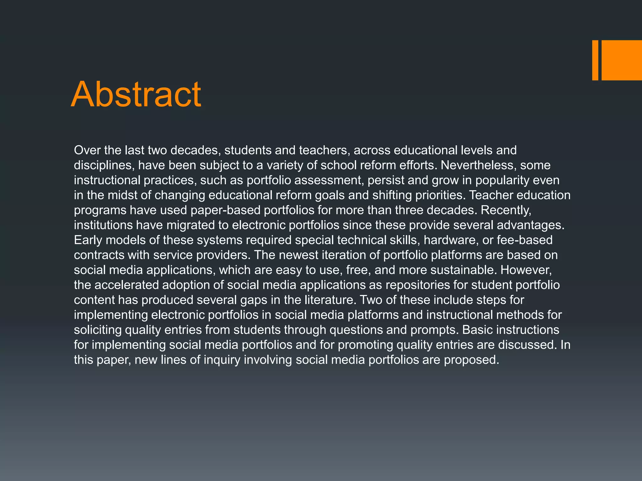 This document discusses implementing electronic portfolios through social media platforms and provides recommendations. It summarizes that while portfolios have been used in education for decades, institutions are now migrating to electronic formats which provide advantages but initially required technical skills. The newest iteration uses social media applications that are easy to use, free, and sustainable. However, literature on implementing portfolios through social media and promoting quality entries is still limited. The document provides steps for implementation, including defining scope and purpose, selecting a platform, creating a model, and instructing on appropriate use. It also provides recommendations for using questions and prompts to promote quality portfolio entries.