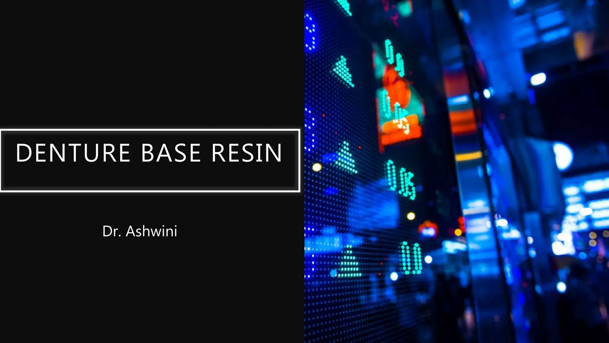 The document discusses denture base resins, including their history, properties, classifications, and advancements in materials used in dentistry. It highlights the evolution from vulcanite to polymethyl methacrylate (PMMA), and details various types of resins, their polymerization processes, and requirements for ideal denture base materials. The conclusion reflects on the promising advancements in denture resins and potential future applications to improve dental treatments.